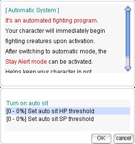 Players can configure their character to sit and recover HP and SP by setting an auto sit HP/SP threshold as a percentage.
