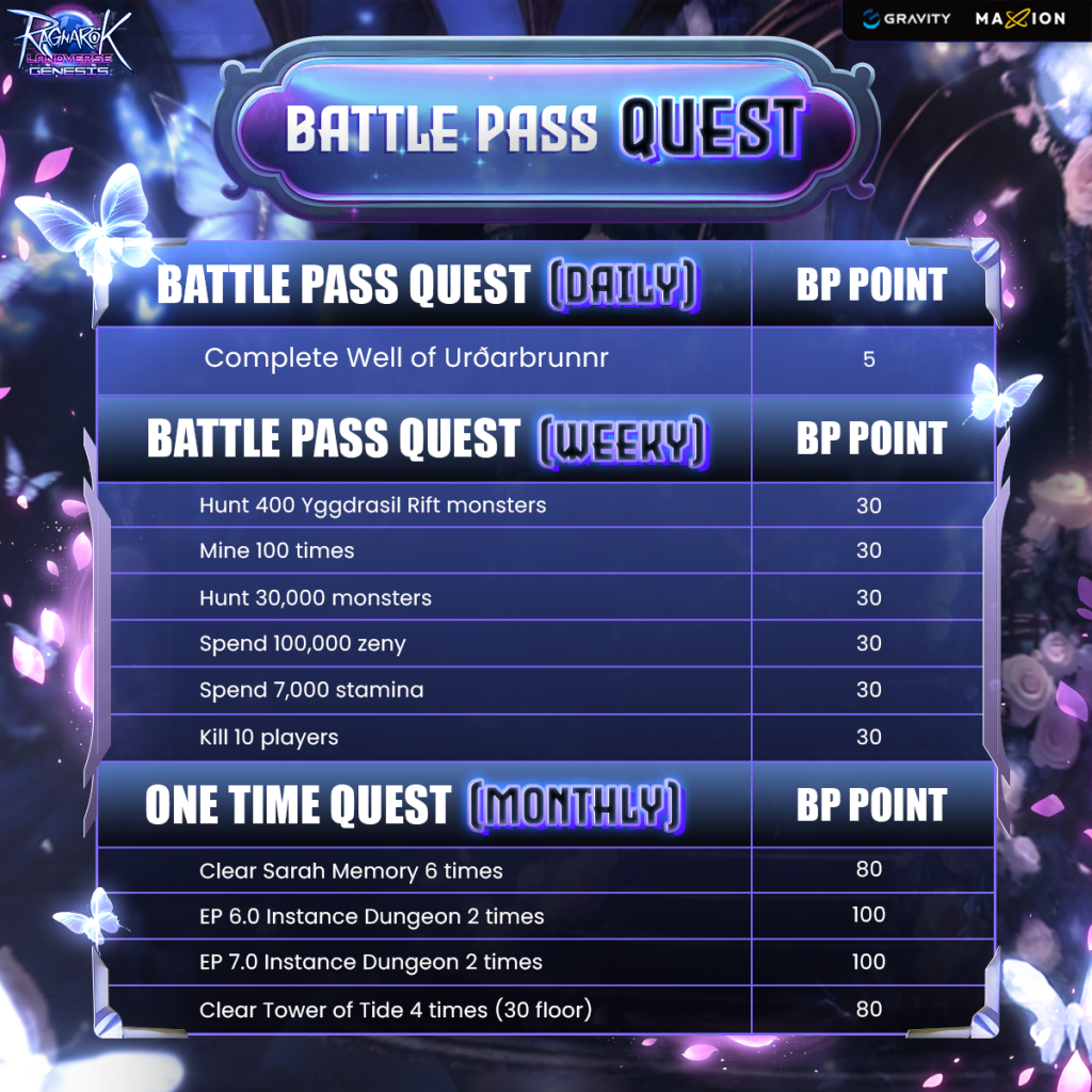 Quests reset every Monday at 00:00 (UTC+8) You can select up to 3 out of 6 weekly quests. Even if you ‘Accept all quests’, only 3 can be submitted. Level up your Battle Pass by completing quests. For every 20 BP Points, you’ll gain 1 Battle Pass level.