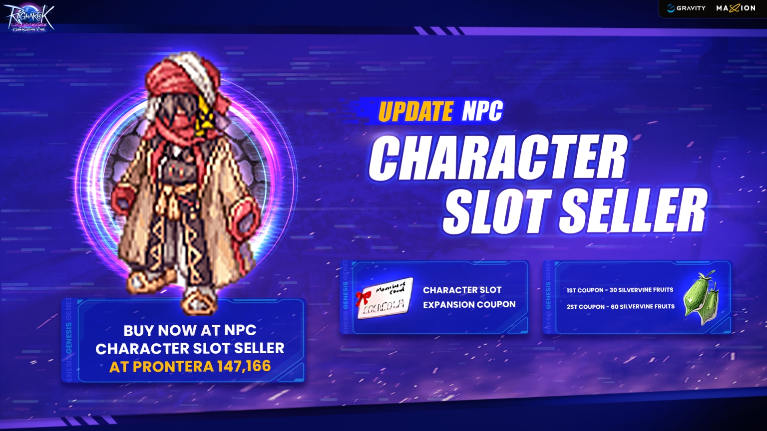 📍 Visit the NPC at Prontera (147,166) 🎟️ Character Slot Expansion Coupon • 1st Coupon — 30 Silvervine Fruits • 2nd Coupon — 60 Silvervine Fruits
