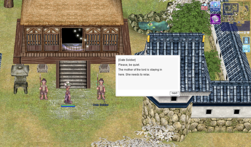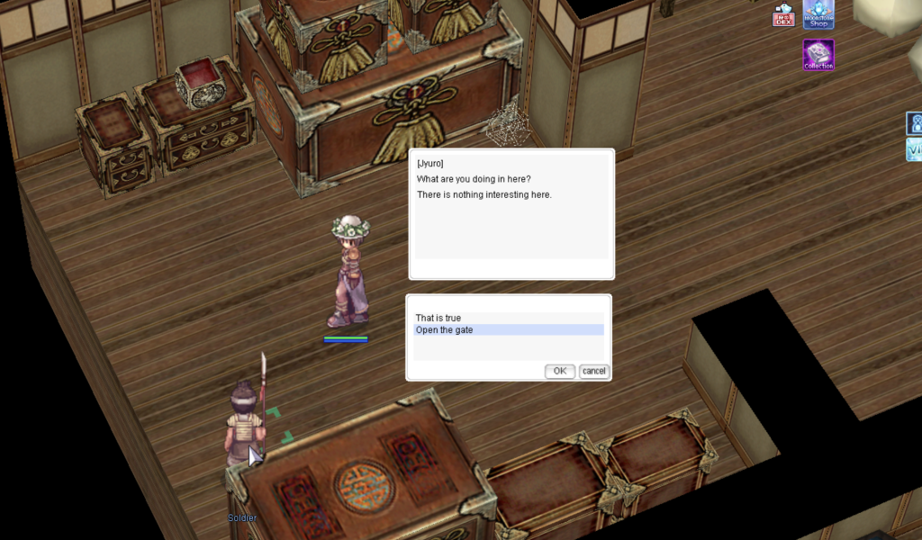 Once you have the permit, go up the staircase where you will find a guard inside. Select the option โPlease open the gate for me!!โ and you will be able to enter Amatsu Dungeon.