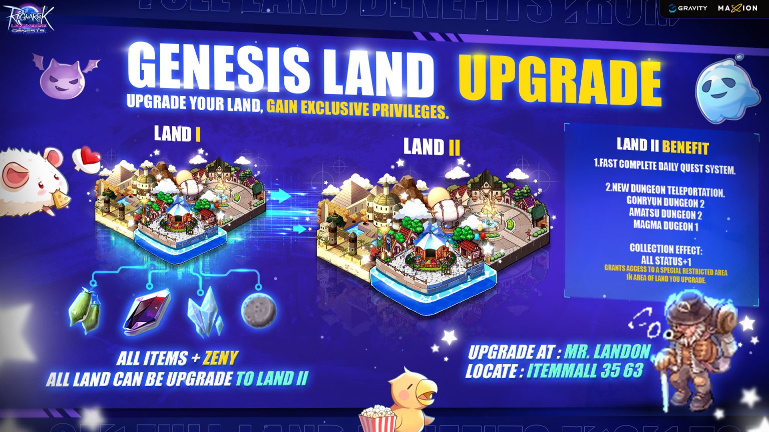If you add 6 lands to your collection, youβll always receive +1 to all stats. It doesnβt matter whether they are all the same type or mixed (for example, Land I and Land II together still give +1). Level II lands use the same map as before. When depositing more than one land, the game will display the order clearly: Land of Izlude I β Land of Izlude II β Land of Morroc I β Land of Morroc II β Land of Prontera I β Land of Prontera II