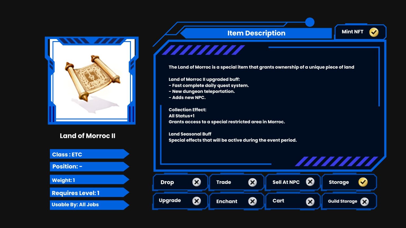 The Land of Morroc is a special item that grants ownership of a unique piece of land