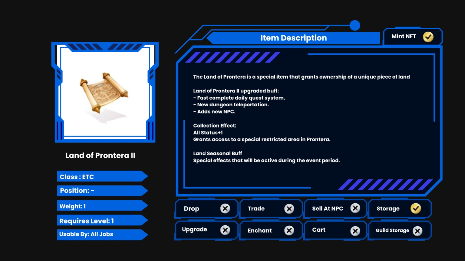The Land of Prontera is a special item that grants ownership of a unique piece of land