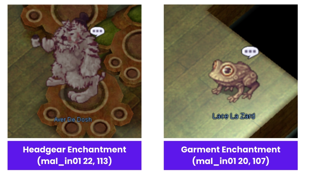 1. NPC Aver De Dosh (mal_in01 22, 113): The NPC responsible for performing the enchantment on your costume headgear. 2. NPC Lace La Zard (mal_in01 20, 107): Handles the enchantment process for the garment costume.
