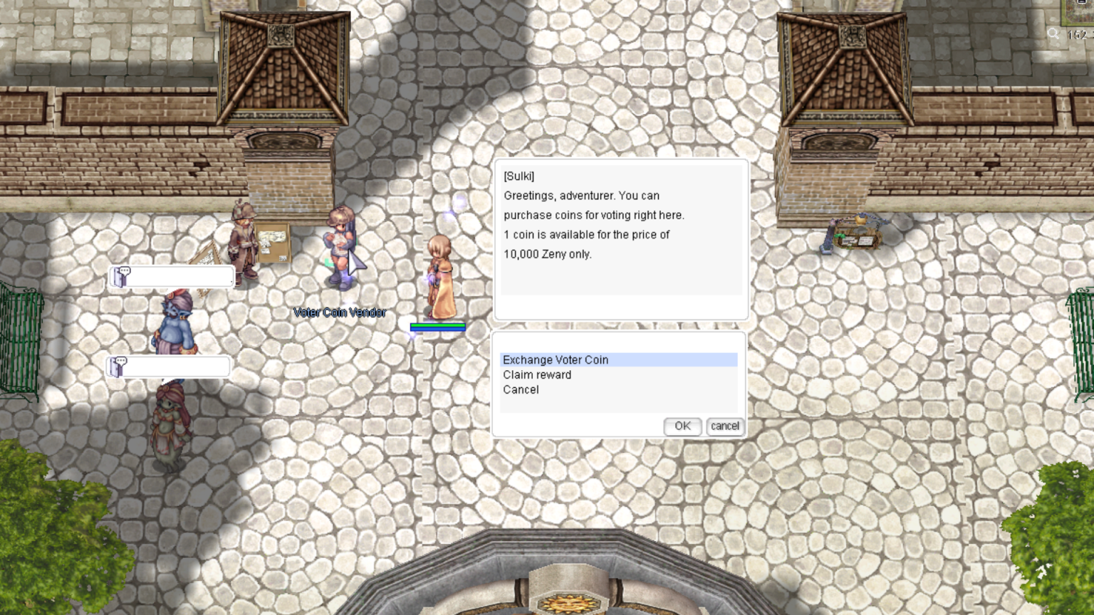 Exchange Voter Coins with the NPC Voter Vender. Players can trade Zeny for Voter Coins at a rate of 10,000 Zeny per 1 Voter Coin.