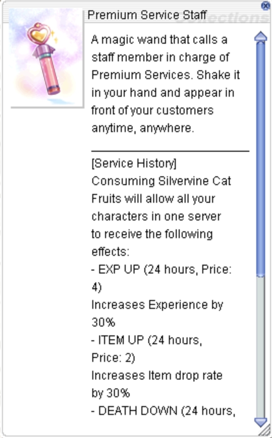 Upon using the Premium Ration Service Box, you will also receive a "Premium Service Staff." This staff allows you to receive additional buffs by consuming a Silvervine Fruit and selecting one of the following options: Turn on screen reader supportTo enable screen reader support, press Ctrl+Alt+Z To learn about keyboard shortcuts, press Ctrl+slashPanida Phoswang has left the document.