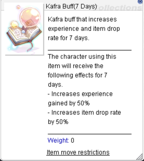 Description: When you open this item, you will receive a Kafra buff for 7 days.