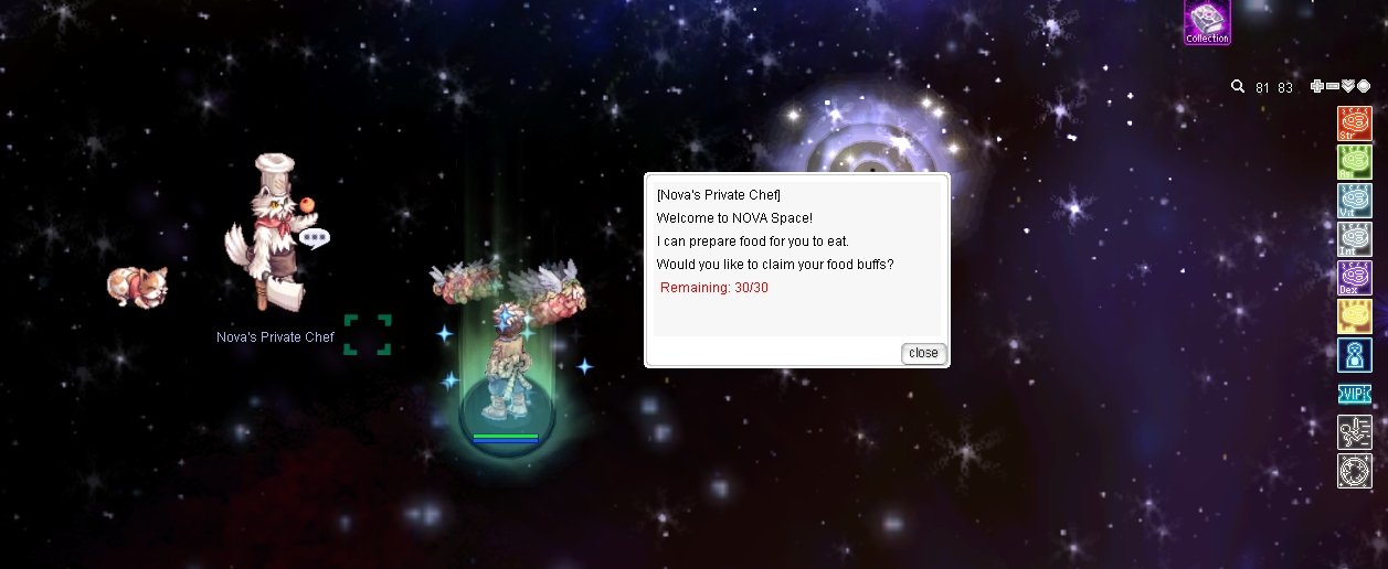 Food Buff: Exclusive food buffs that can only be found in Land/NOVA SPACE, enhancing your character's stats and performance. You can receive Food Buffs up to 30 times per day. The count resets daily.