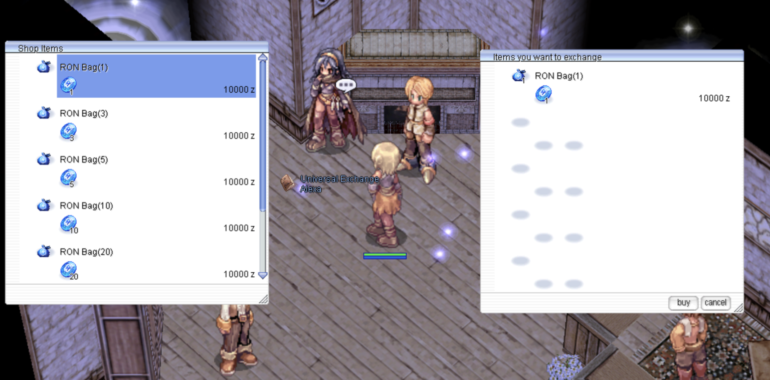 π RON Bag Exchange Rates 1 $RON Coin + 10,000 zeny = π RON Bag (1) 3 $RON Coin + 10,000 zeny = π RON Bag (3) 5 $RON Coin + 10,000 zeny = π RON Bag (5) 10 $RON Coin + 10,000 zeny = π RON Bag (10) 20 $RON Coin + 10,000 zeny = π RON Bag (20) 30 $RON Coin + 10,000 zeny = π RON Bag (30) 50 $RON Coin + 10,000 zeny = π RON Bag (50)