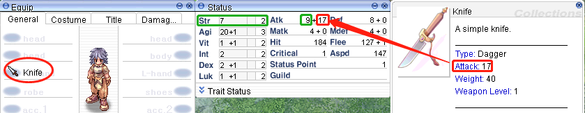 Attack: The physical attack rating for both ranged and melee weapons. It is listed as A + B in the Status Window, where A represents the Status ATK and B represents the sum of Weapon ATK (base weapon damage and its base bonus damage from refinement) and Equip ATK (bonus damage from equipment and buffs). Only B is affected by Element, except when using Mild Wind. The Status Window does not show the total ATK used for the Attack damage calculation.