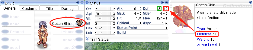 Defense: The defense rating against physical damage. It is shown as A + B in the Status Window, where A represents the Soft DEF and B represents the Hard DEF. Hard DEF cuts damage relatively, whereas Soft DEF is an absolute reduction with that number.