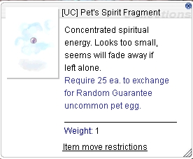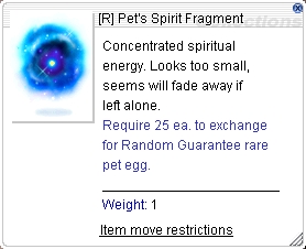 Collect 25 Pet's Spirit Fragments of the same tier and 1,000 zeny to exchange for a Pet's Spirit Guarantee Scroll from Universal Exchange Alexa.
