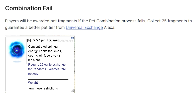 Players will be awarded Pet's Spirit Fragments if the Pet Combination process fails, as detailed in the ROVerse Manual Book.