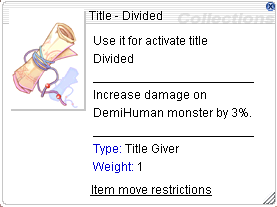 * **Proof Of Hero** 30000 for **Item Title: Divided -** Increase damage on DemiHuman monster by 3%**.**