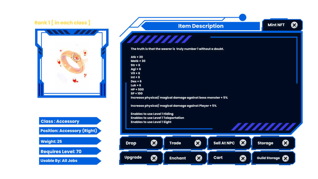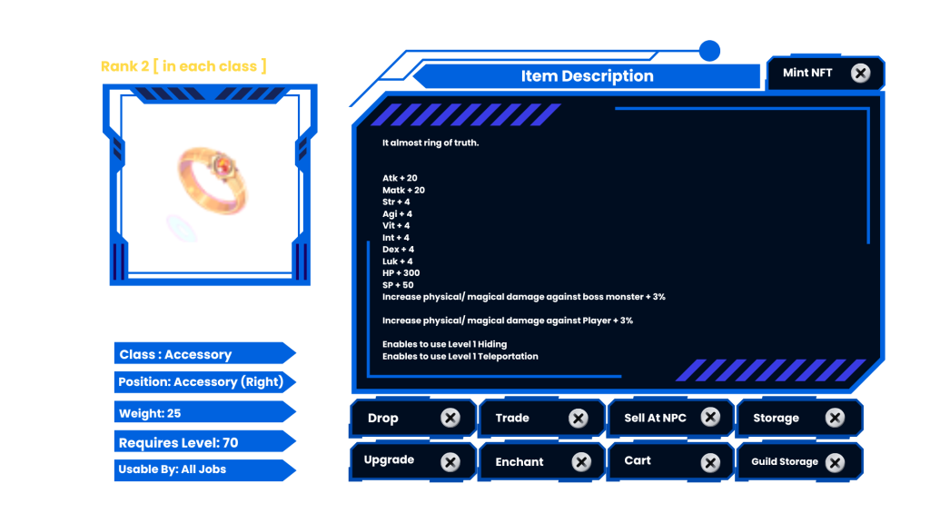 Title : Path Traveler II Atk + 5 Matk + 5 Hit + 5 Flee + 5 β Titles cannot be stored.