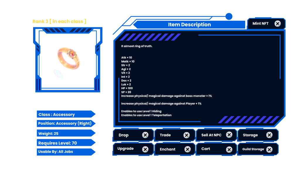 Title : Path Traveler III Atk + 10 Matk + 10 Hit + 10 Flee + 10 β Titles cannot be stored.