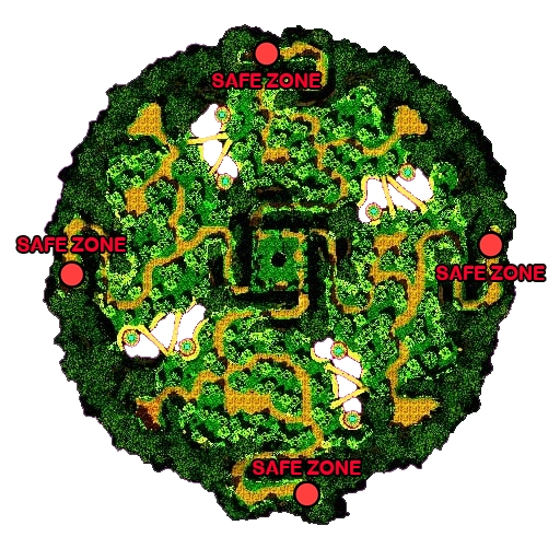 The map contains four Safe Zones located at the mid-corners of the map in all four directions. Within these Safe Zones, players cannot attack each other or be attacked by monsters. Additionally, monsters will not attack players in these Safe Zones.