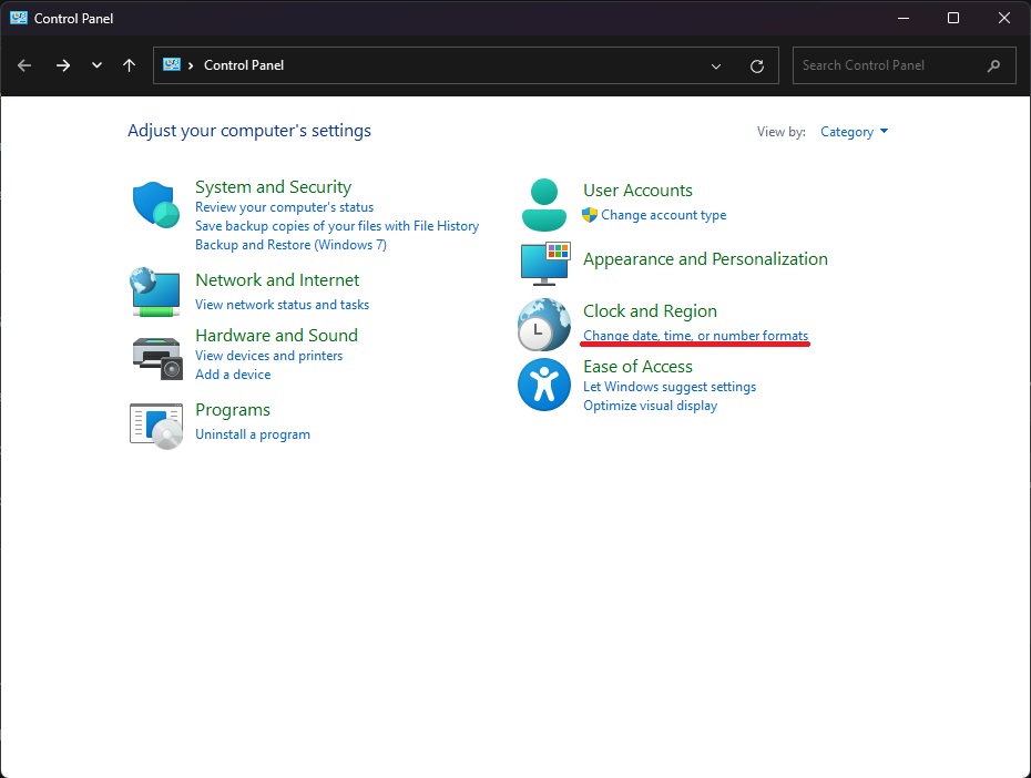 In Control Panel, click on "Change date, time, or number formats" (located above the red line in the image).