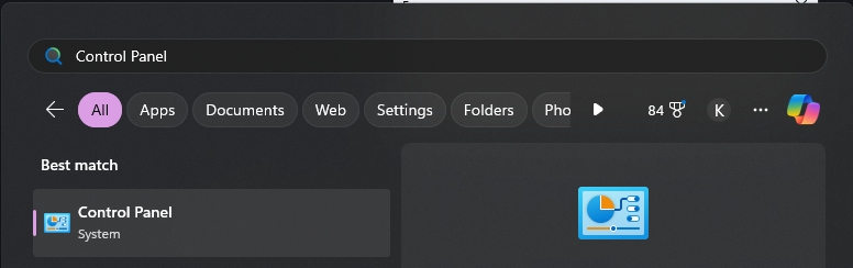 Type "Control Panel" in the Windows Search Box and click on "Control Panel" from the search results.