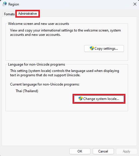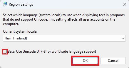 Uncheck the box next to "Beta: Use Unicode UTF-8 for worldwide language support" (ensure there's no checkmark) and Click "OK" and restart your PC.
