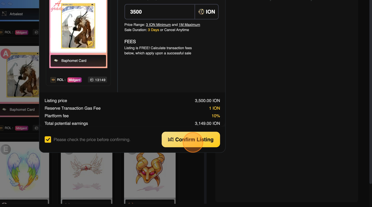 Click on [Confirm Listing] to list your item in the Marketplace.