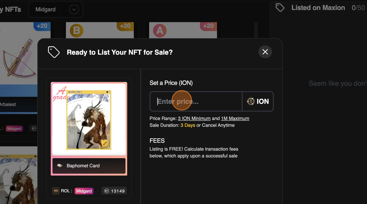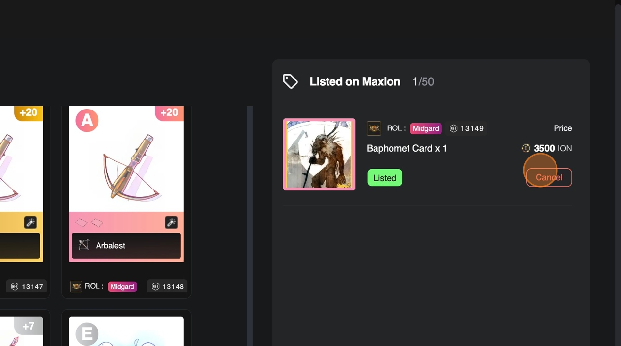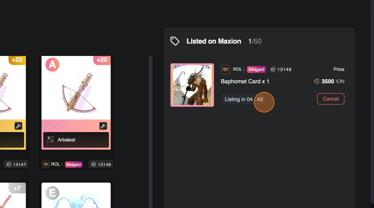 Listed item will be shown on [Listed on Maxion] section in the Marketplace Inventory and your NFT will be listed on marketplace after 5 minutes listing cooldown.